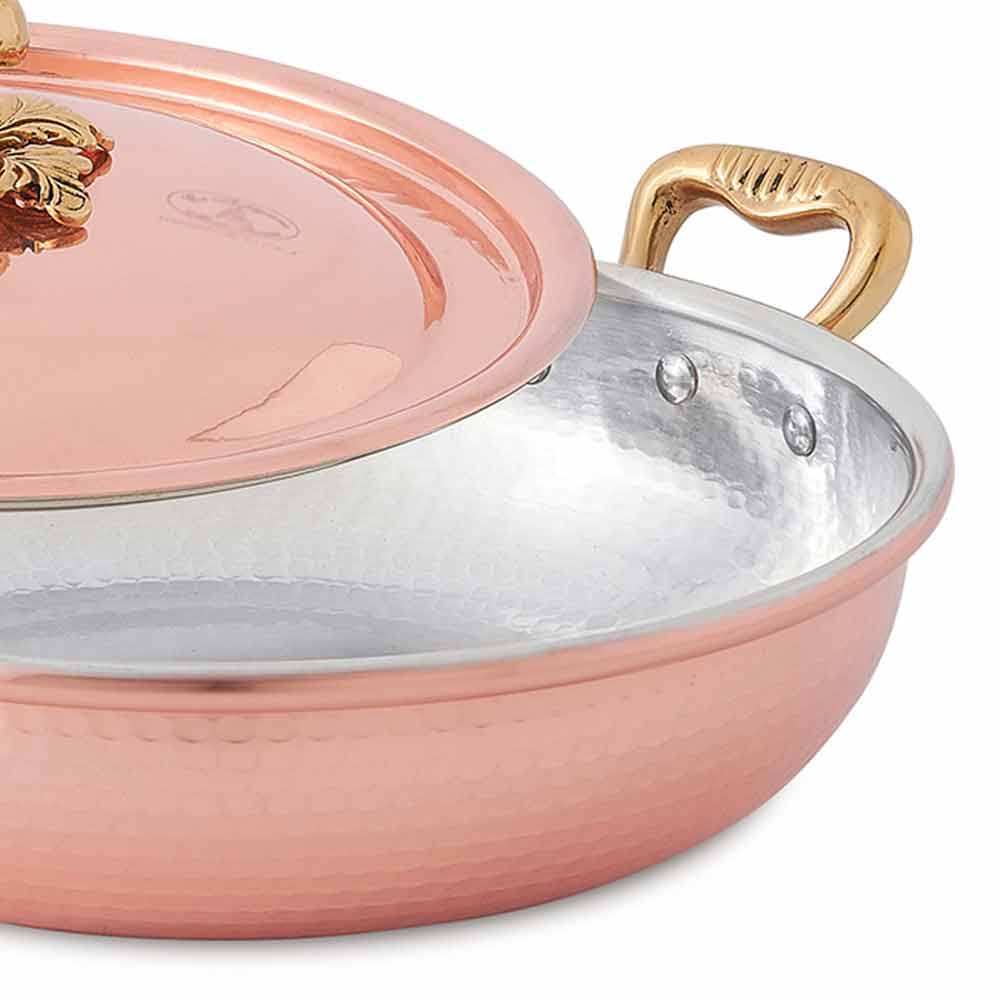 Tegame rotondo in rame stagnato e martellato a mano con coperchio, made in Italy.