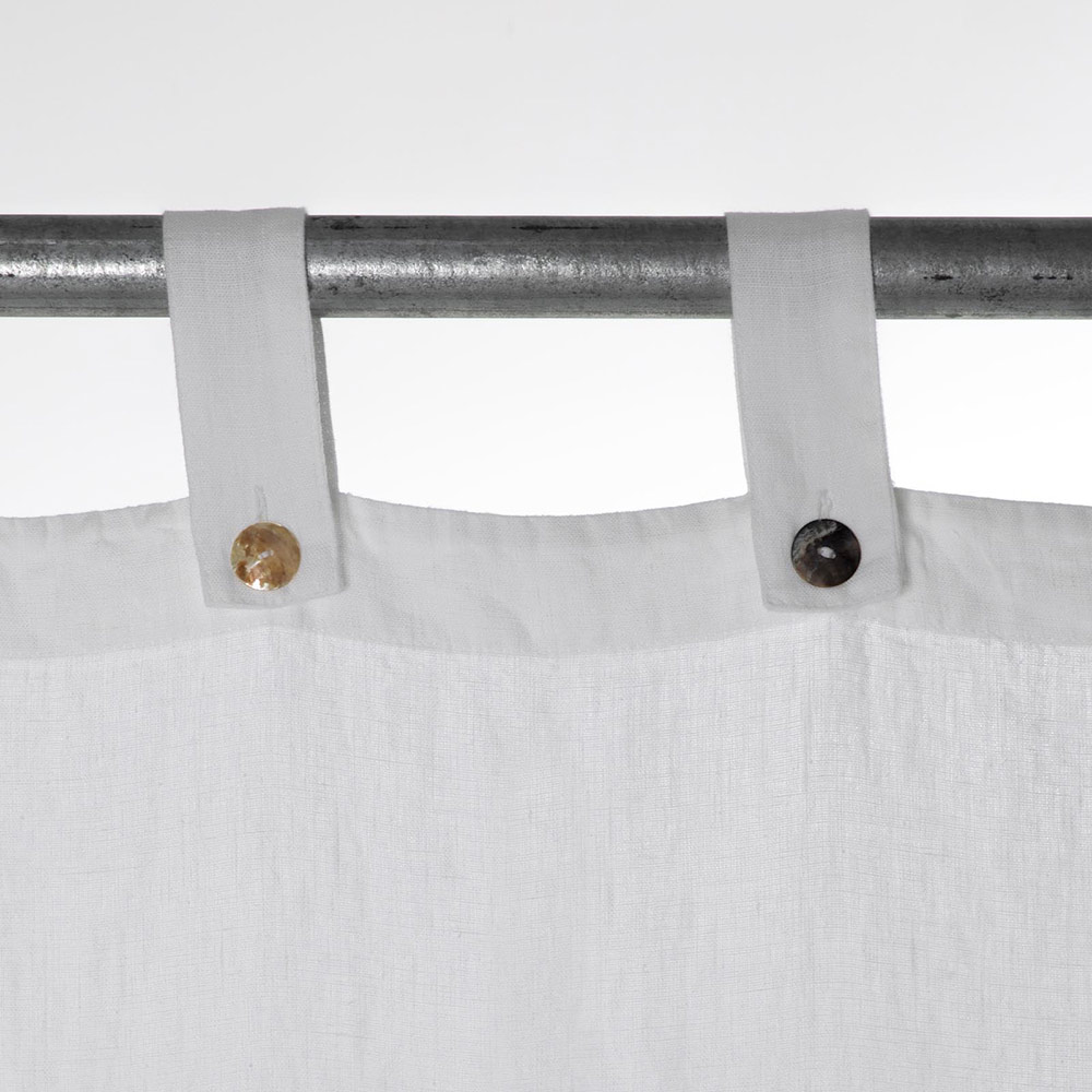 tenda bianca in lino pesante con bottoni Agoya in madreperla per l'allacciatura.