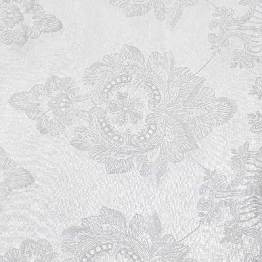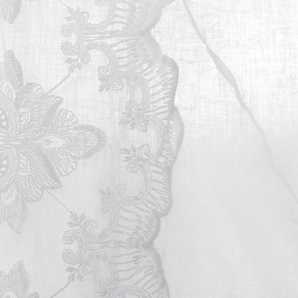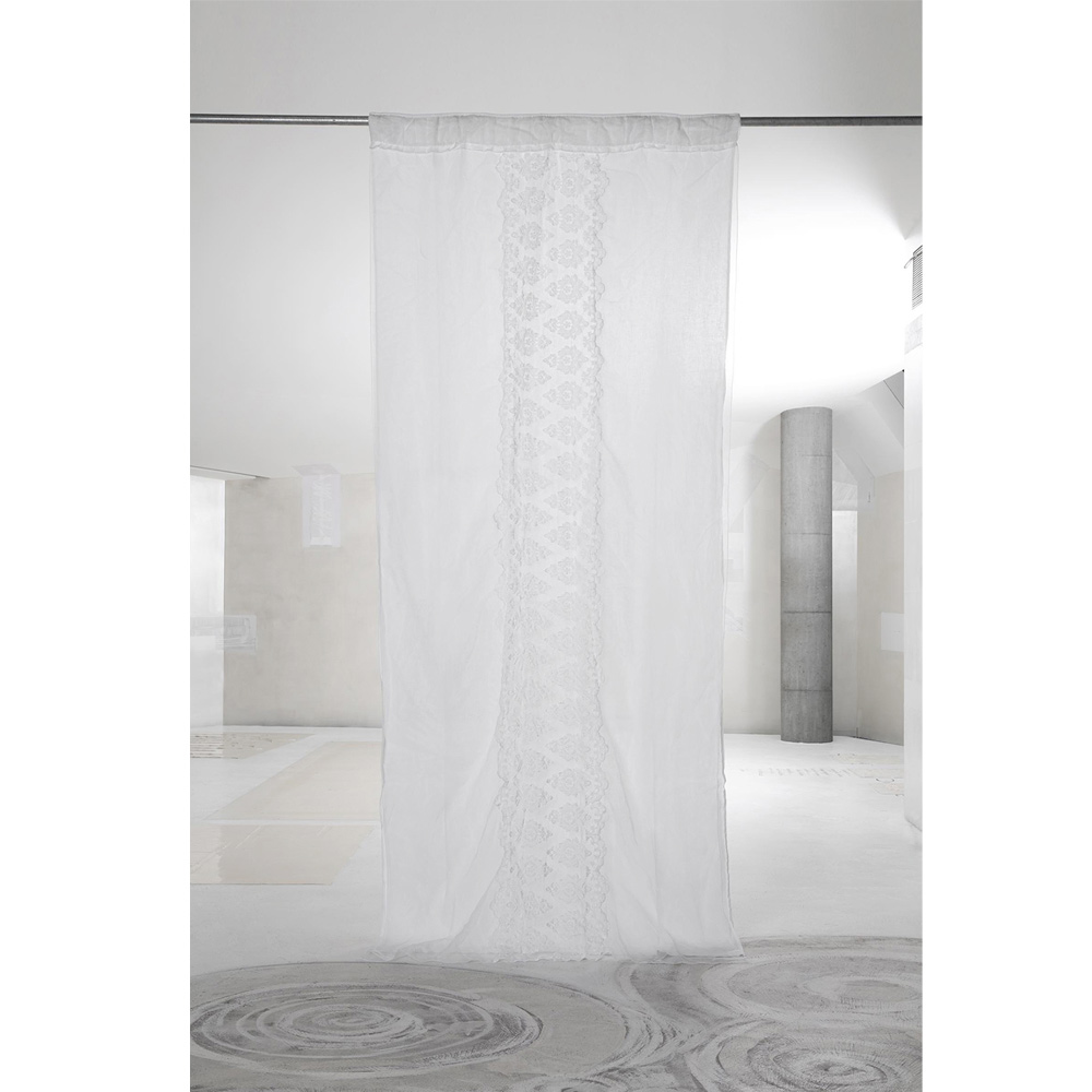 Tenda bianca di lino e organza con ricamo centrale verticale e predisposizione per bastone, qualità artigianale made in Italy.