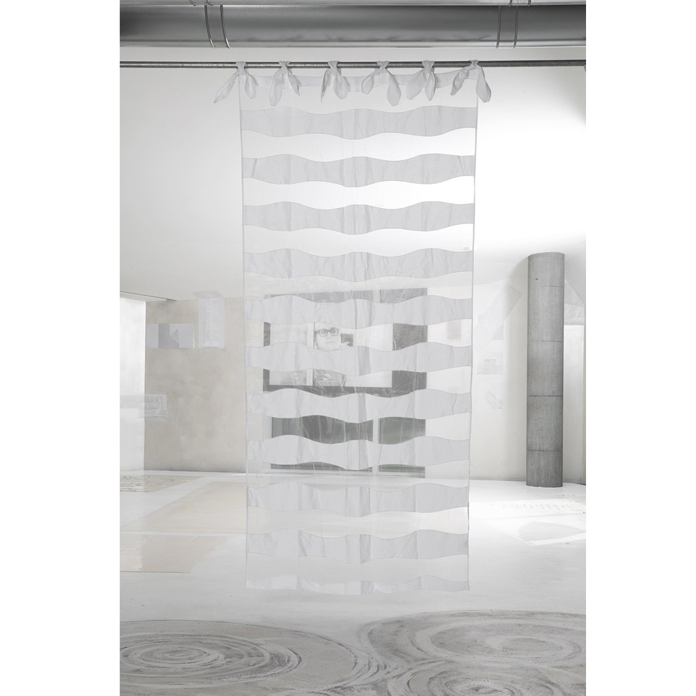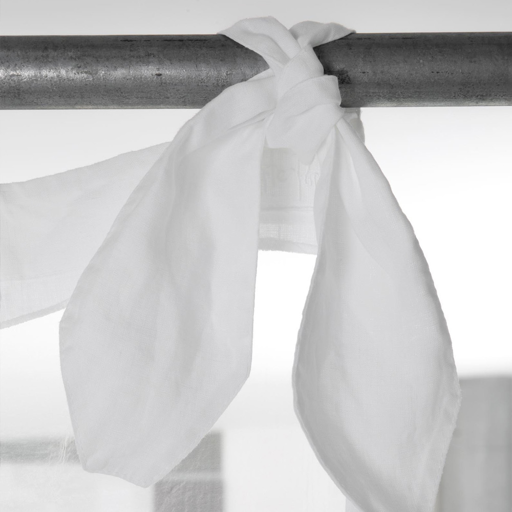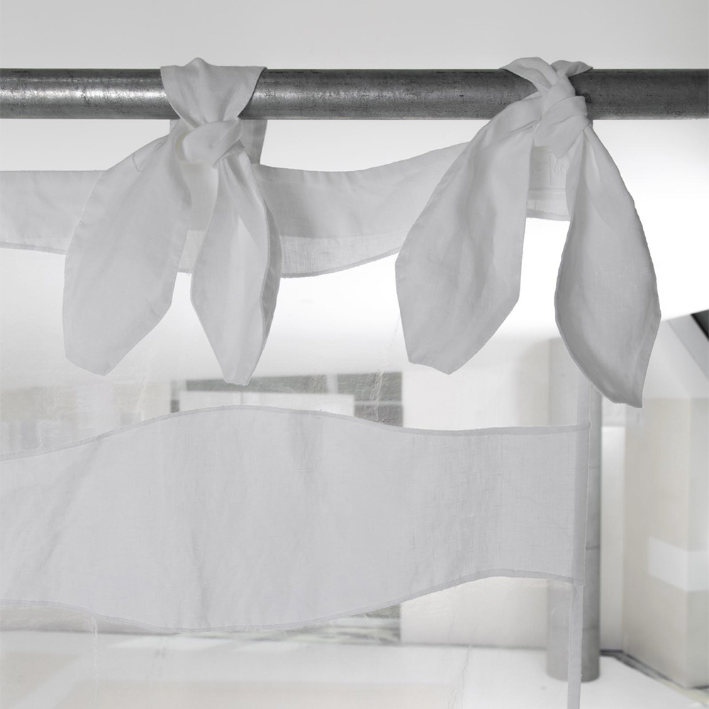 Tenda bianca in lino e organza con ricamo a onde e allacciatura con laccetti, qualità artigianale made in Italy.