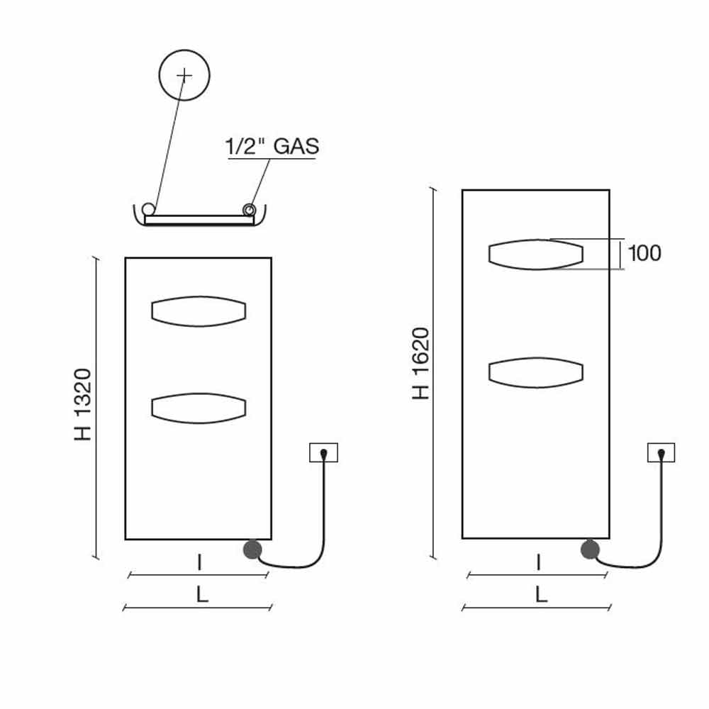 All'altezza va aggiunto il termostato di 110 mm. Scatola termostatica bianca di serie per i radiatori bianchi; cromata per i radiatori colorati e finiture inox. Alimentazione monofase 230 volt.