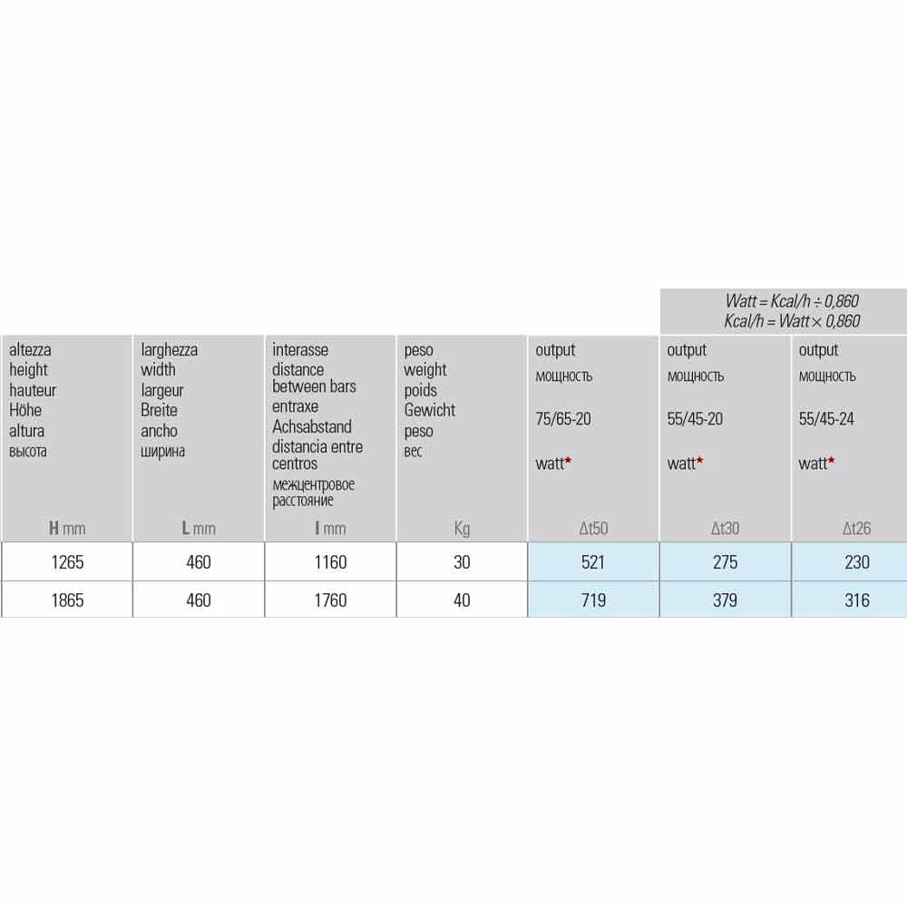 - H 1265 x L 460 x Inter.1160 mm x Resa w(Δt50*) 521; Resa w(Δt30*) 275; Resa w(Δt26*) 230 (1 mensola);