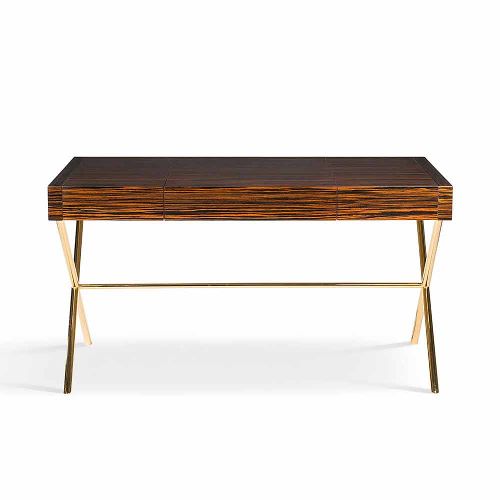 Realizzato in vero legno di ebano lucido o madreperla bianca, giunzione a 45°, interno laccato opaco e piano centrale apribile con specchio e luce a LED in dotazione. Base in metallo galvanizzato finitura oro 24 kt lucido.