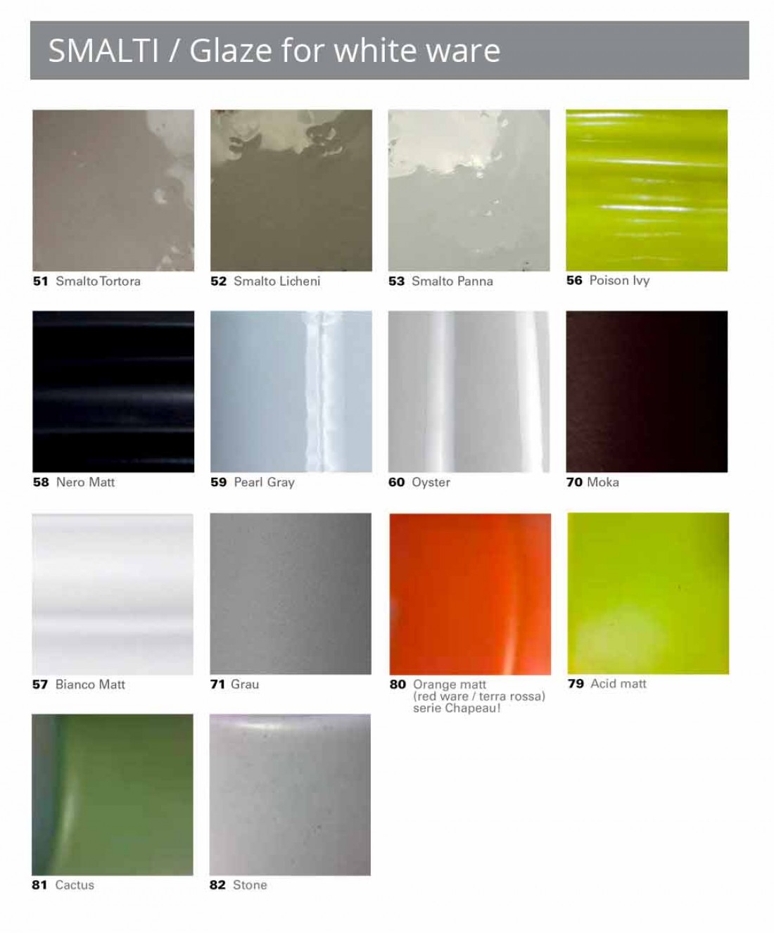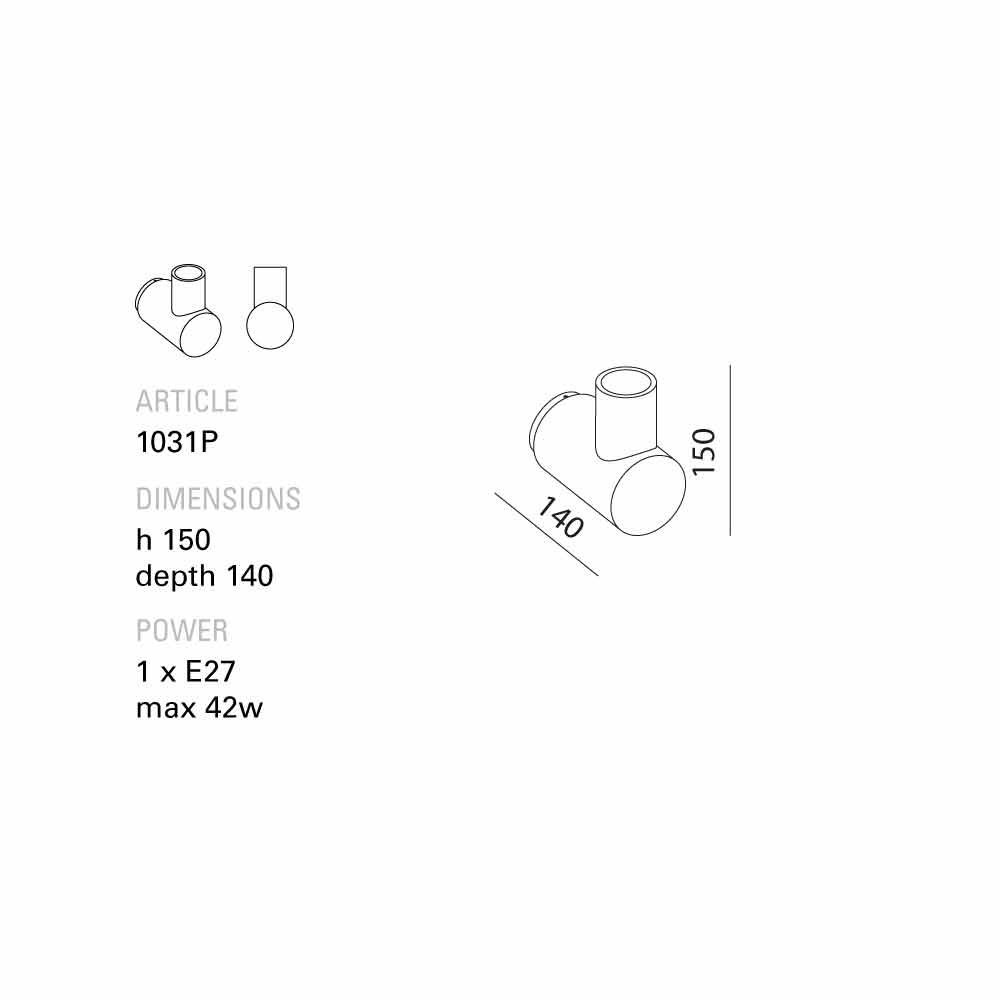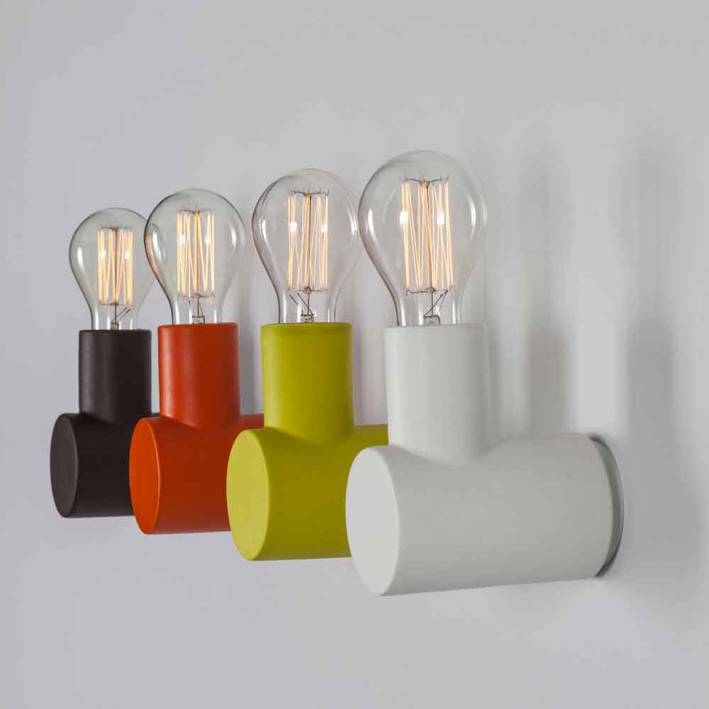 Il modello è formato da un cilindro centrale che contiene l’ attacco elettrico, da questo si diramano altri cilindri laterali in varie posizioni. È realizzato in ceramica bianca colata, verniciata a smalto e con doppia cottura a oltre 1000 gradi. I componenti in metallo sono di vari colori tra cui il bianco e l’ arancio, questo prende spunto dai primi prodotti industriali anni ’ 60, o verde fluorescente come i vestiti segnaletici di chi lavora sulle strade.