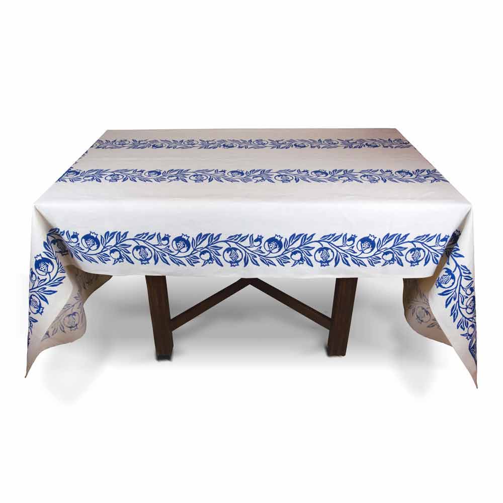 Tovaglia di alto artigianato italiano in lino e cotone realizzata con pregiata ed artistica stampa a mano in colore blu lungo i bordi ed il centro, lavorazione manuale su tessuti antichi esclusiva made in Italy.