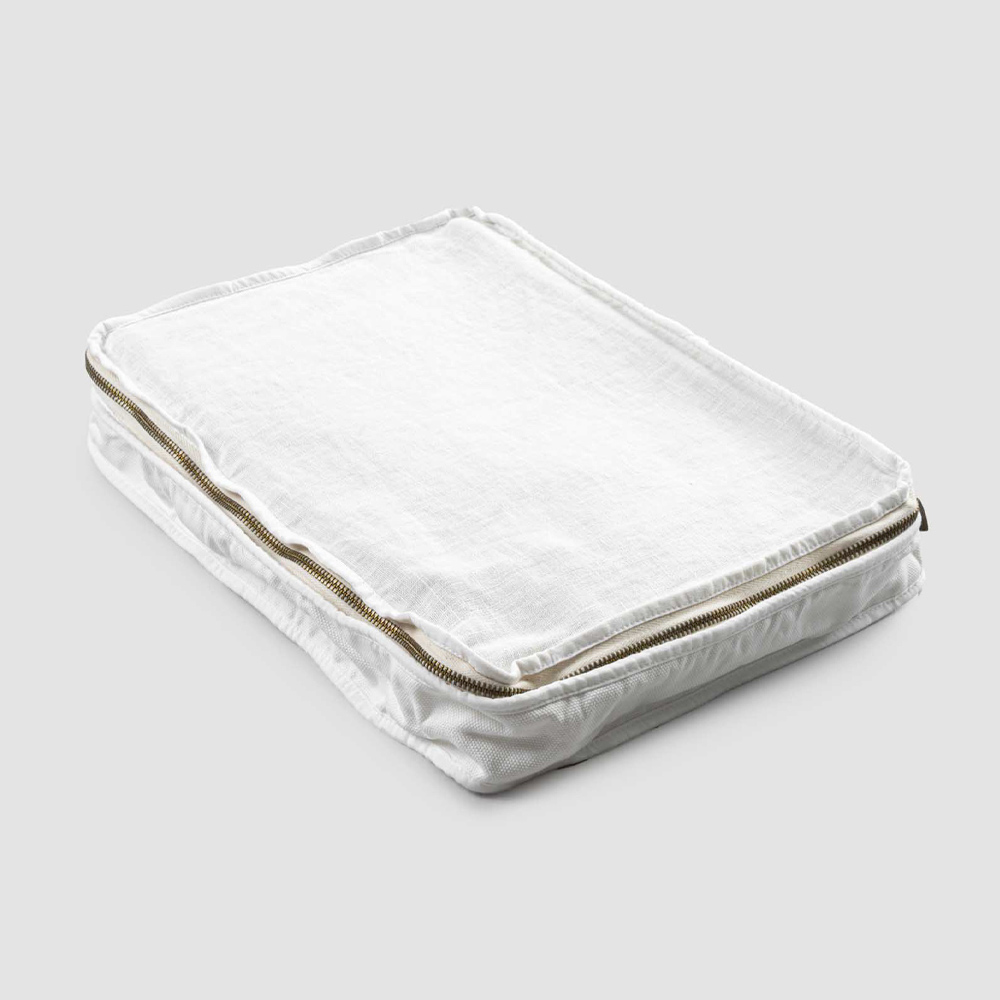Prodotta in Italia realizzata in lino e cotone di alta qualità e resa morbida al tatto grazie a trattamenti speciali che ne esaltano l’aspetto naturale, la trousse è creata con un tessuto ipoallergenico e antibatterico, in aggiunta all’uso di tinture naturali e anallergiche che donano lucentezza e brio alla fibra naturale.