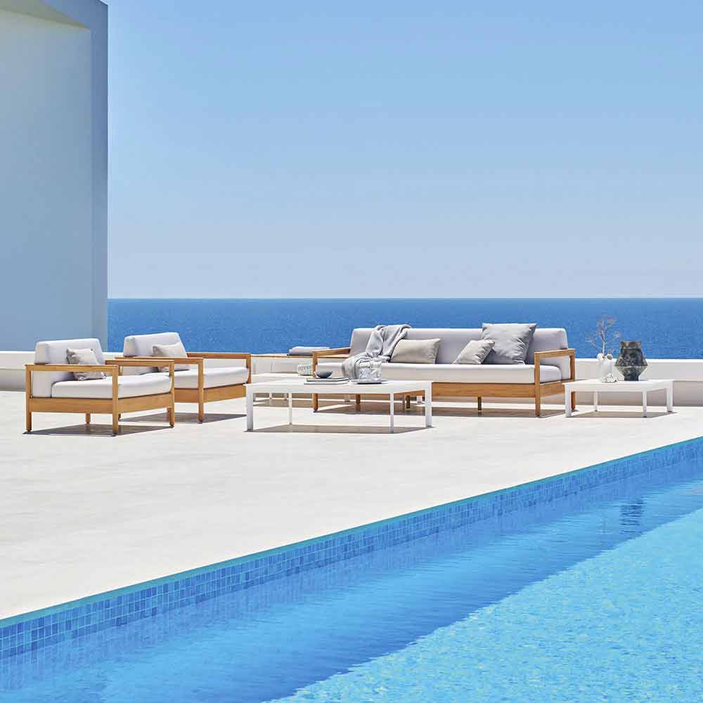 Bali è un meraviglioso divano tre posti da esterno, caratterizzato da una struttura portante a vista in legno massello di teak di piantagione certificata e sedute e schienali rivestiti in tessuto e imbottiti con gomme Dryfeel.