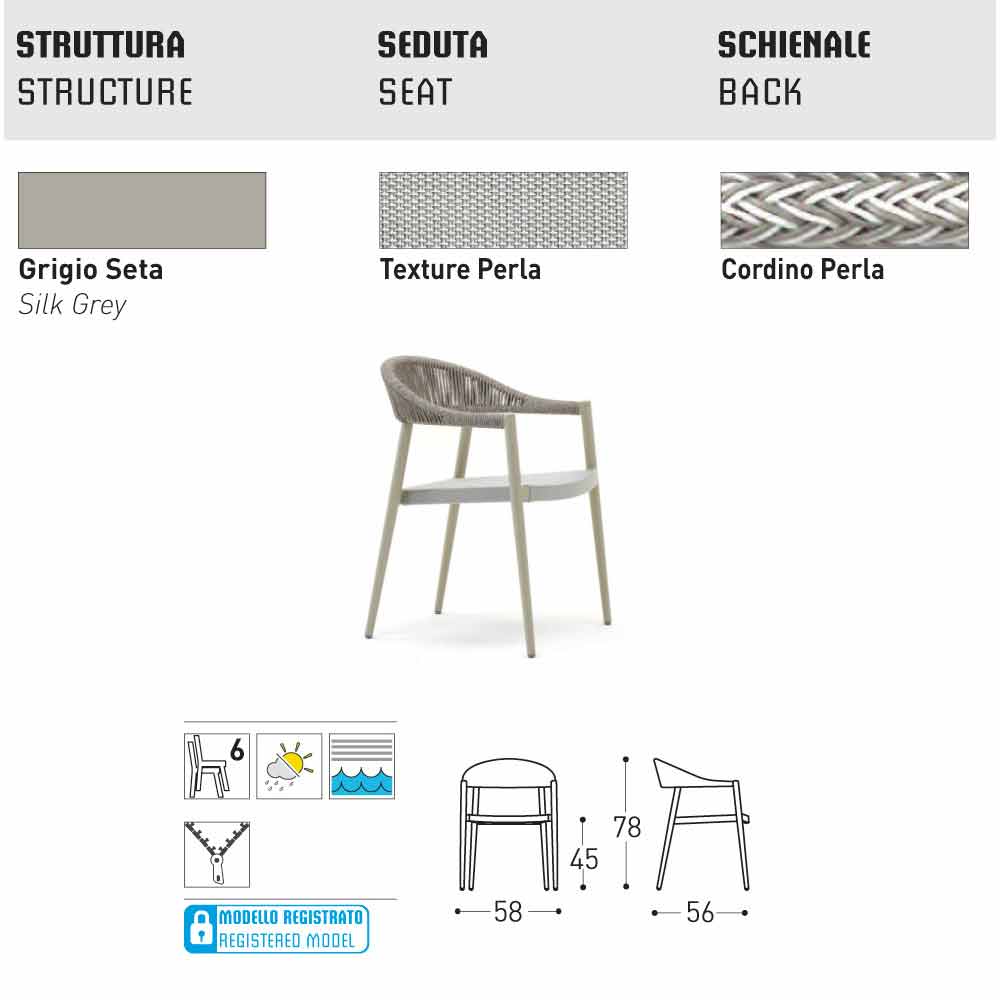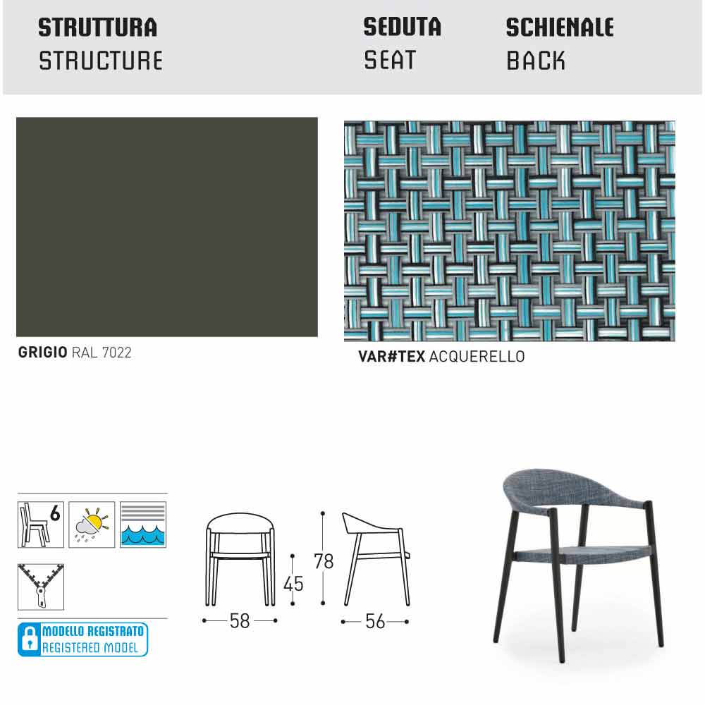 Collezione con struttura in alluminio, sedute e schienali in Texture traforato in differenti cromie oppure in VAR#TEX. Disponibile anche versione con schienale in cordino.