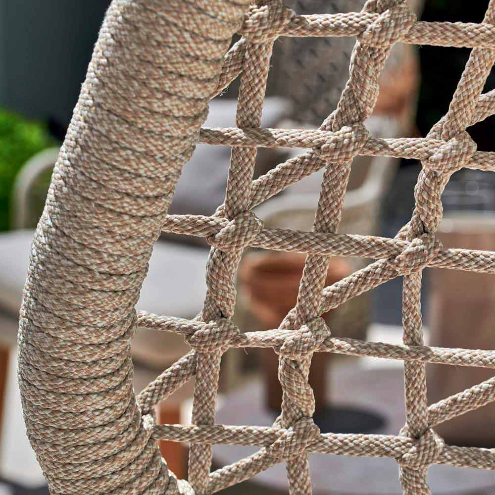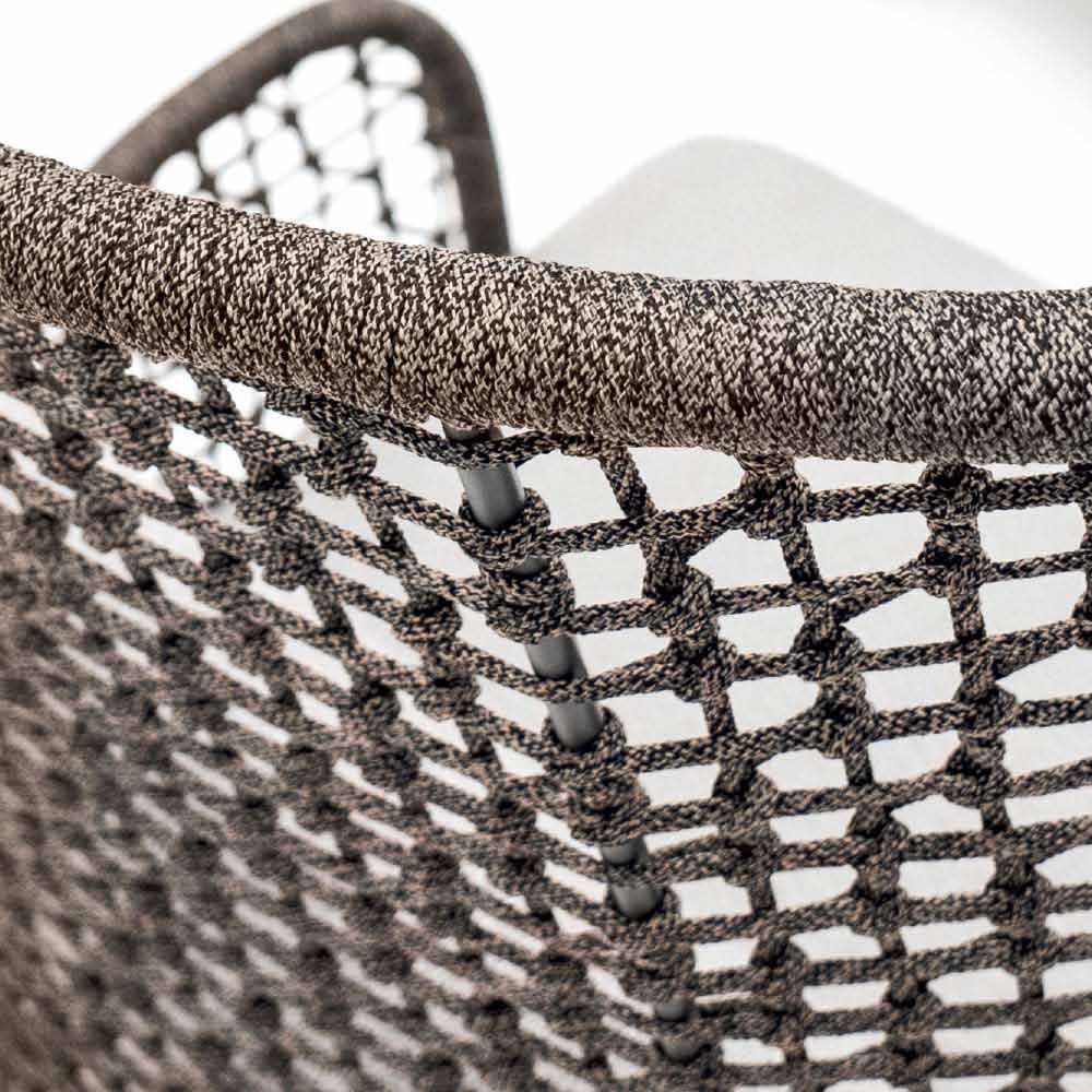Emma è una fantastica poltrona da giardino caratterizzata una struttura in fibra sintentica intrecciata a mano con intelaiatura in alluminio verniciato a polveri a scelta tra due colori: beige e dark grey.