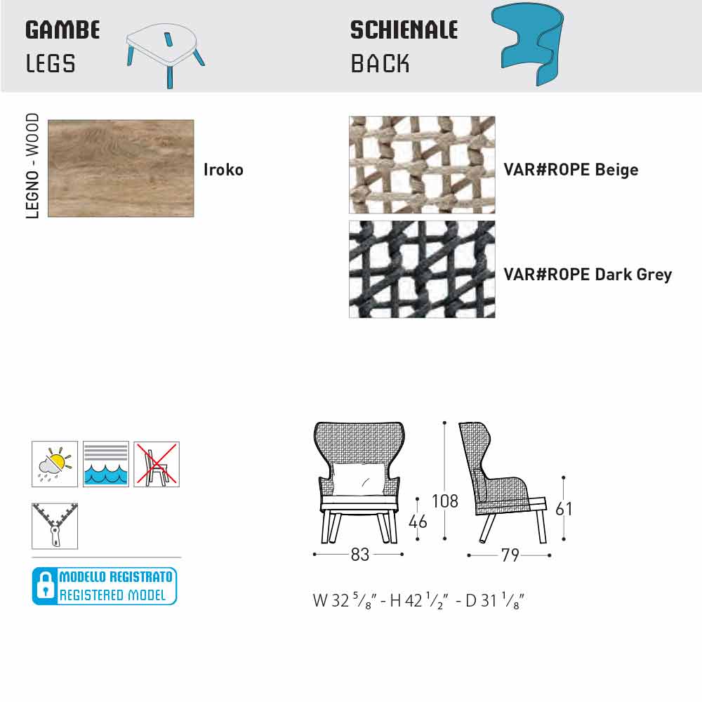Inoltre si presenta con delle gambe in legno massello di iroko e una seduta imbottita con gomme Dryfeel rivestita in tesuto.
