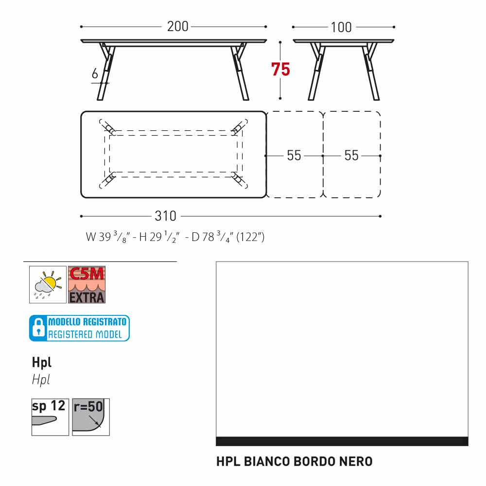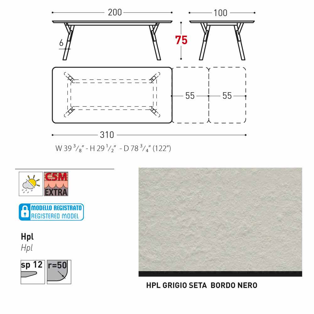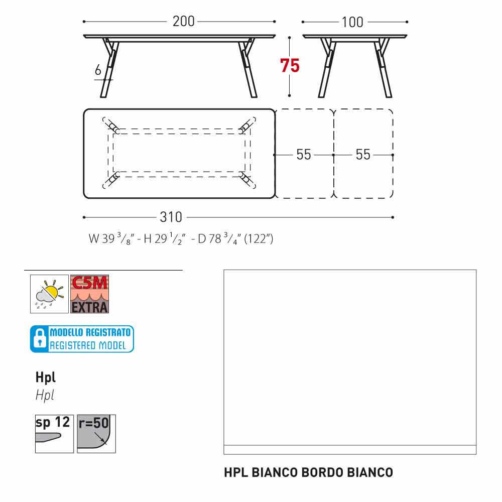 100x200/310xH75 cm - 2 allunghe da 55 cm ciascuna