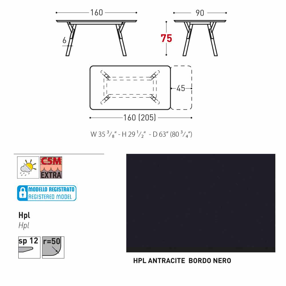 90x160/205x H 75 cm - 1 allunga da 45 cm