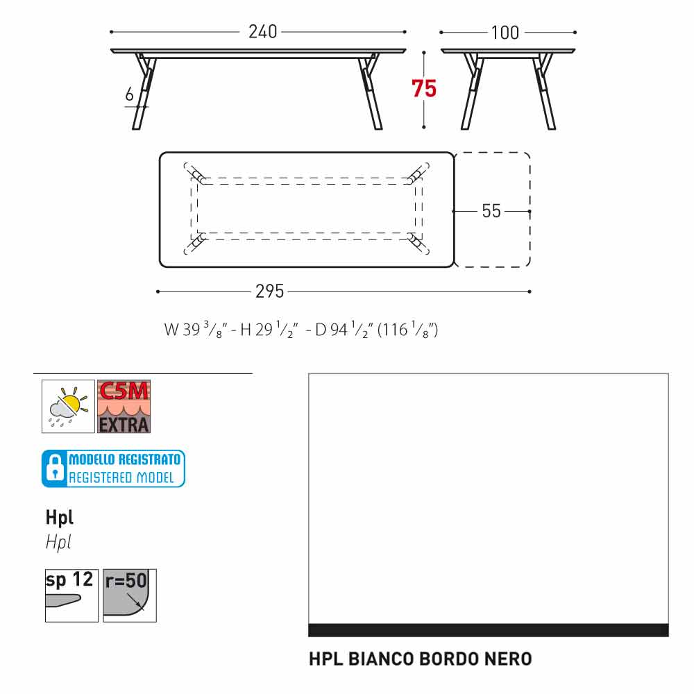 100x240/295xH75 cm - 1 allunga da 55 cm