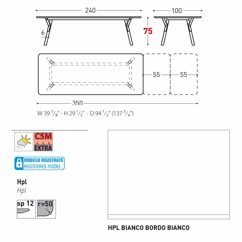 100x240/350x75cm - 2 allunghe da 55 cm ciascuna