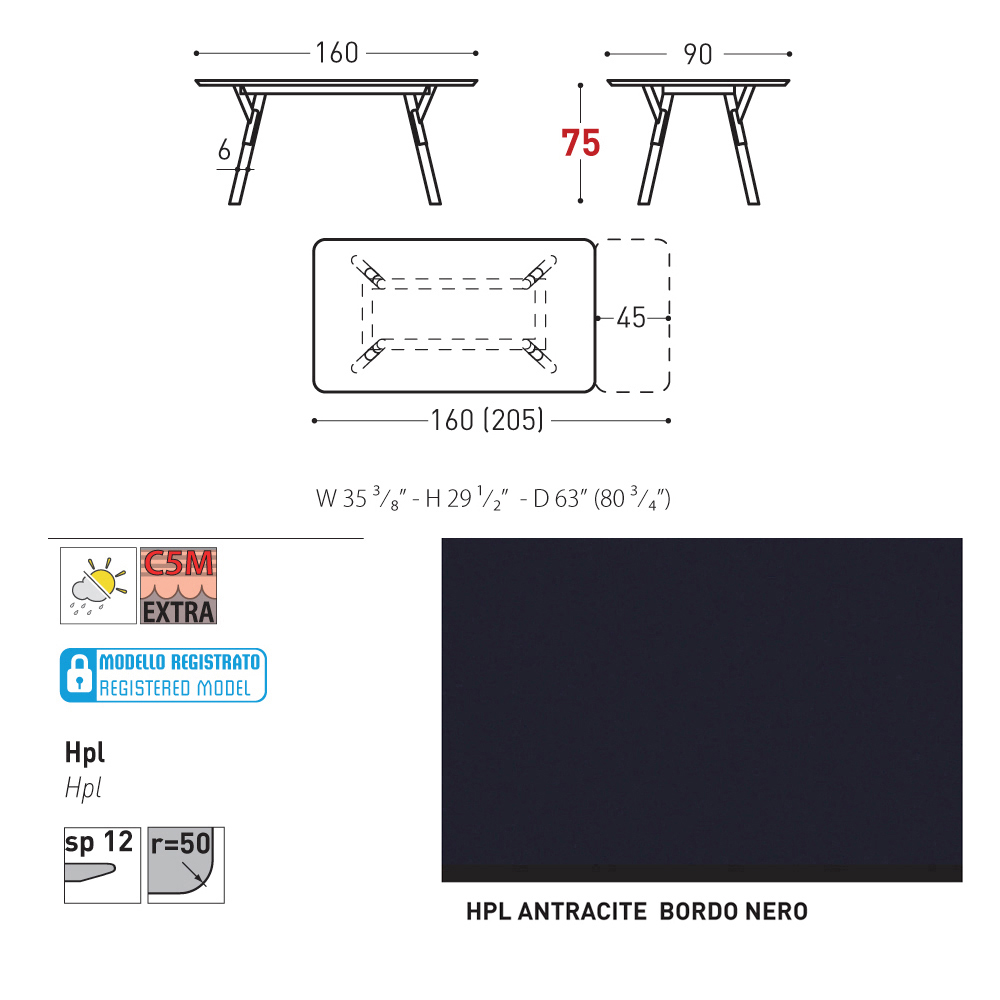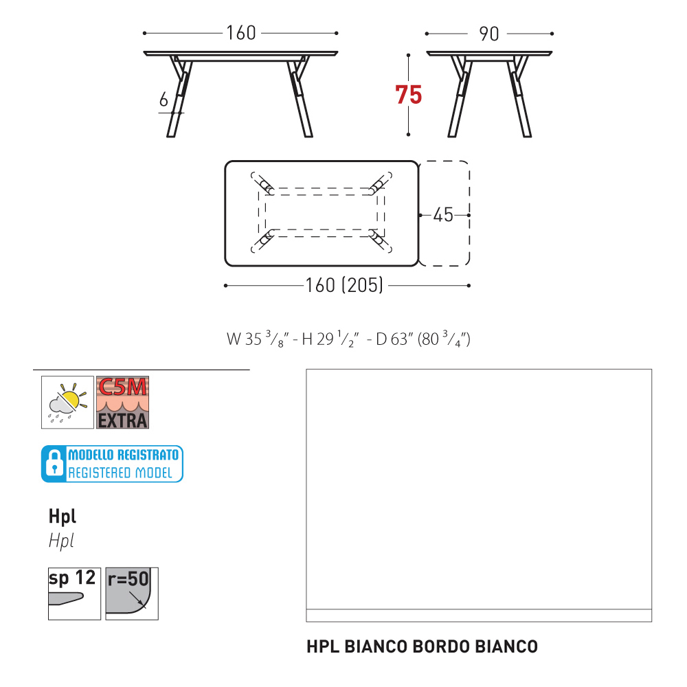 90x160/205x H 73.2 cm - 1 allunga da 45 cm