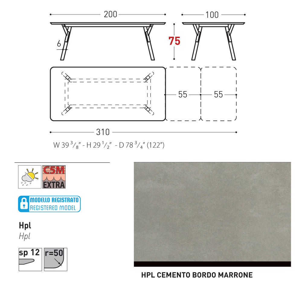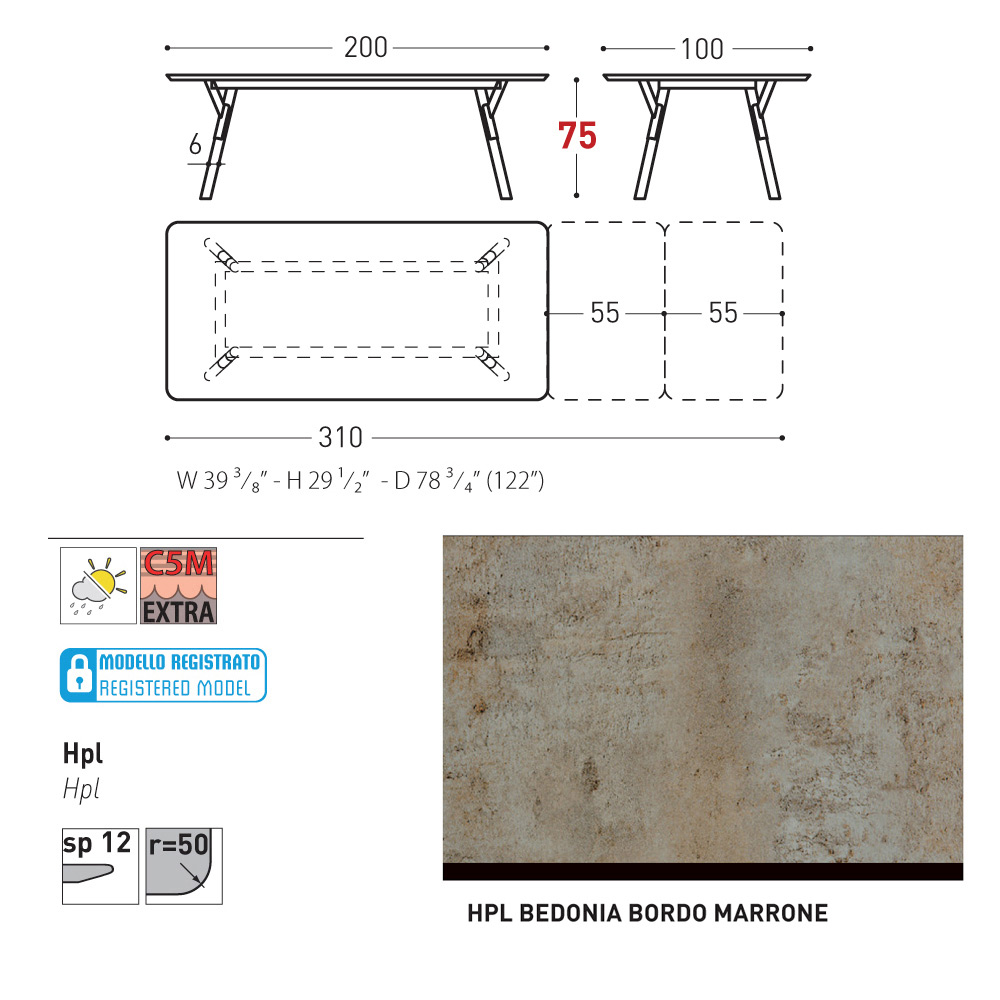 100x200/310xH73.2 cm - 2 allunghe da 55 cm ciascuna