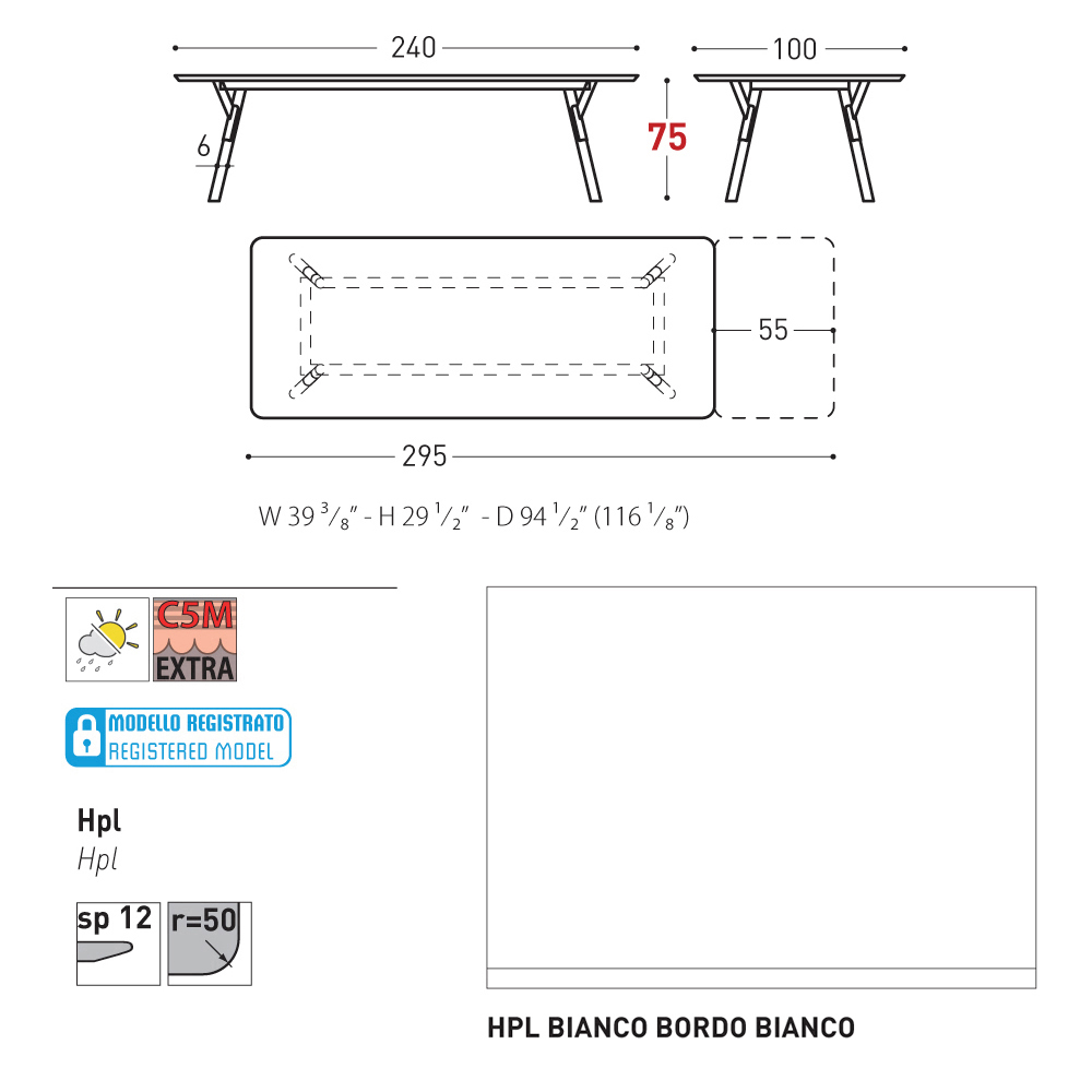 100x240/295xH73.2 cm - 1 allunga da 55 cm