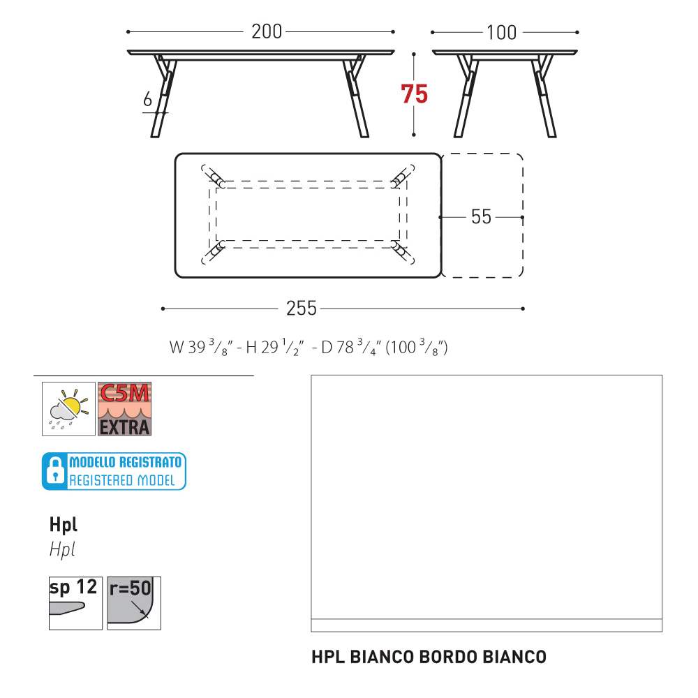 100x200/255xH73.2 cm - 1 allunga da 55 cm