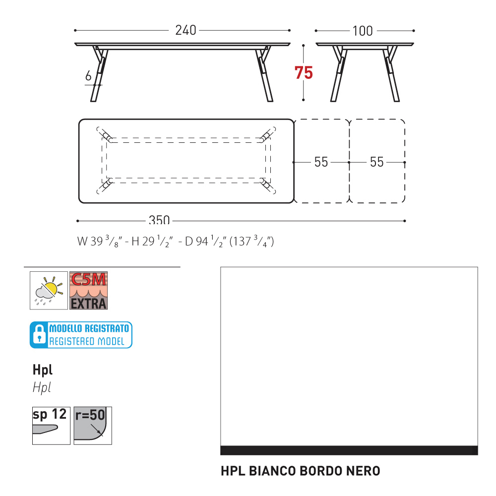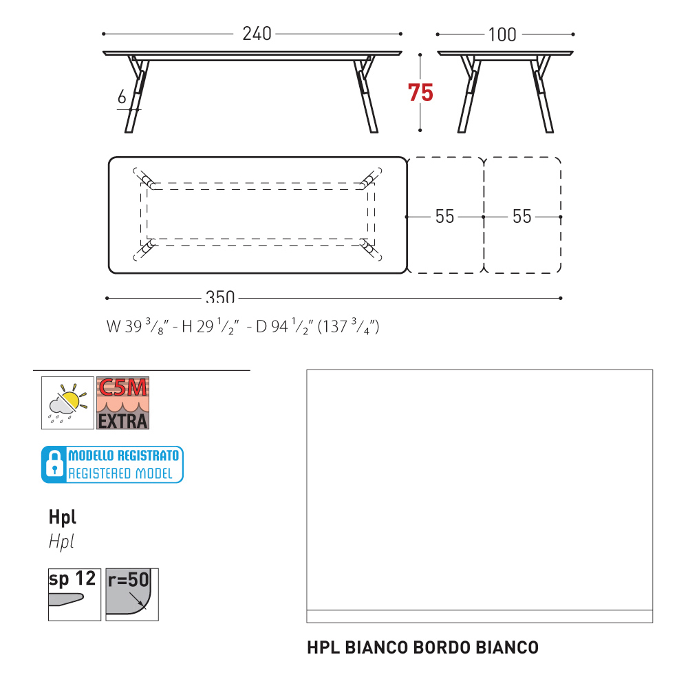 100x240/350x73.2cm - 2 allunghe da 55 cm ciascuna