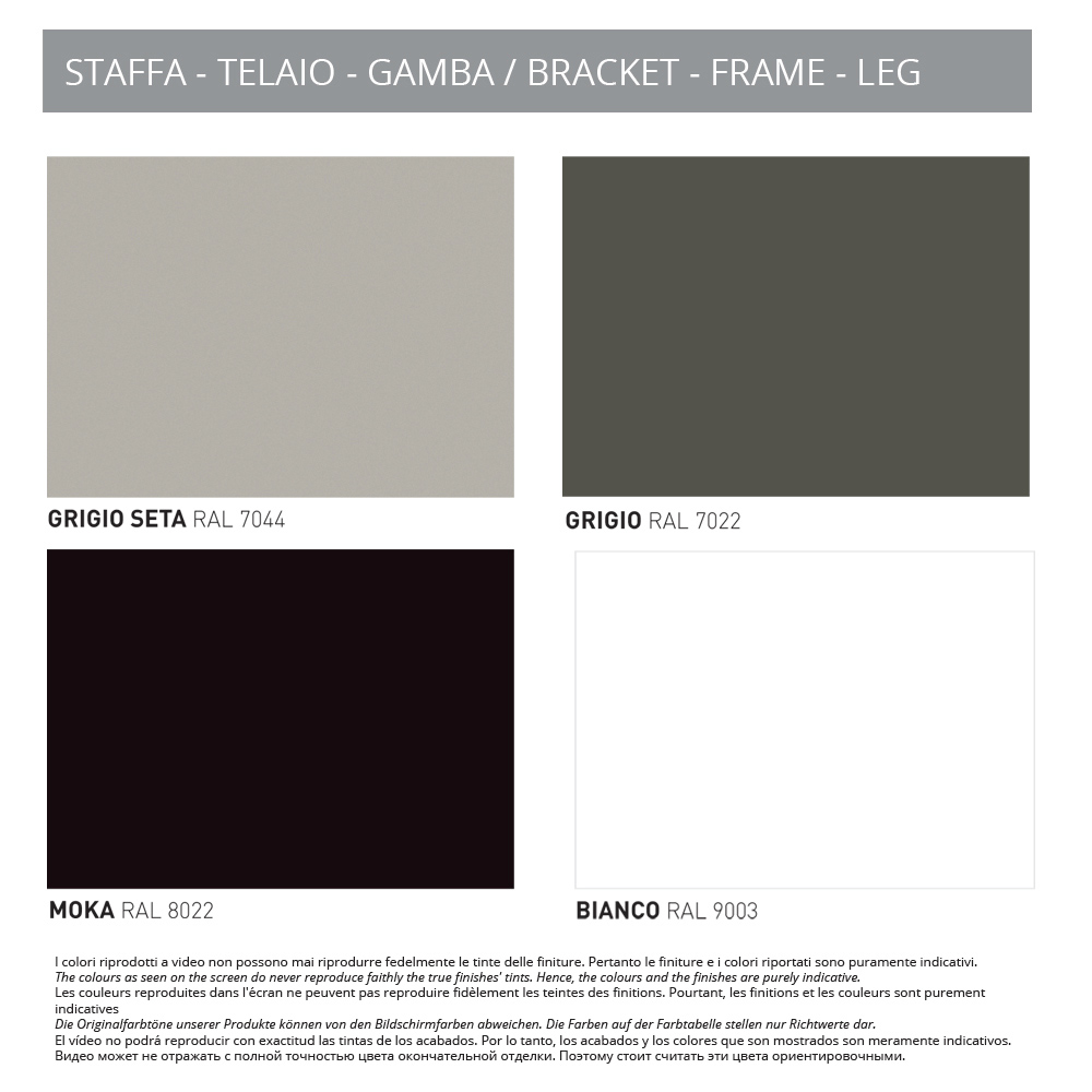 Come scegliere la finitura: seleziona dal menu a tendina la misura e la variante di piano desiderate. Visualizza la cartella colori ed indica nell'apposito box il codice della finitura desiderata per struttura e gambe.
