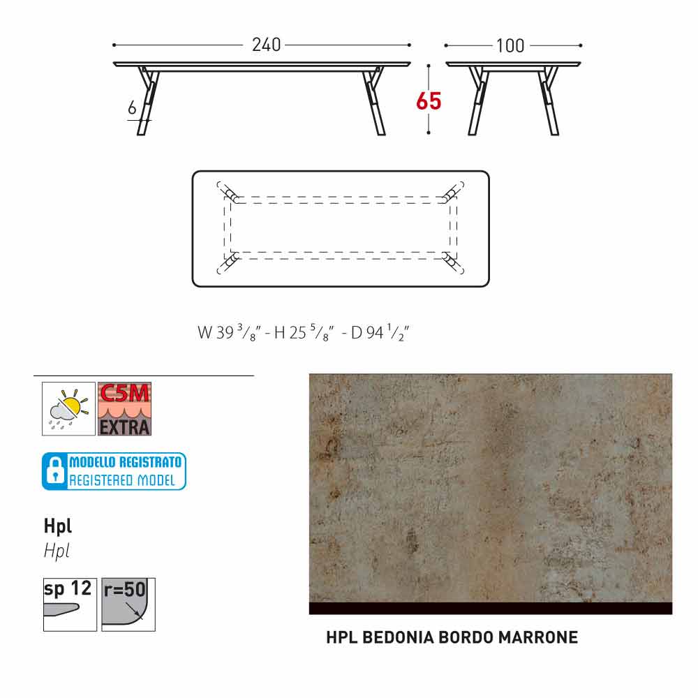Caratteristiche HPL: laminati ad alta pressione. Sono costituiti da numerosi strati di carta (70%) impregnati con resine termoindurenti (30%) e compattati attraverso l'azione combinata di calore (circa 150 gradi ) e alta pressione (maggiore di 7Mpa) per circa 45-50 minuti. Il risultato è un prodotto stabile, non reattivo, non poroso e di alta densità, con caratteristiche fisiche e chimiche di alta resistenza meccanica (escursione termica controllata +80; -40 gradi, su tempo limitato inferiore ai 30 secondi alle temperature estreme), esposizione alla luce ed esposizione alle variazioni di temperatura, anche in ambienti marini.