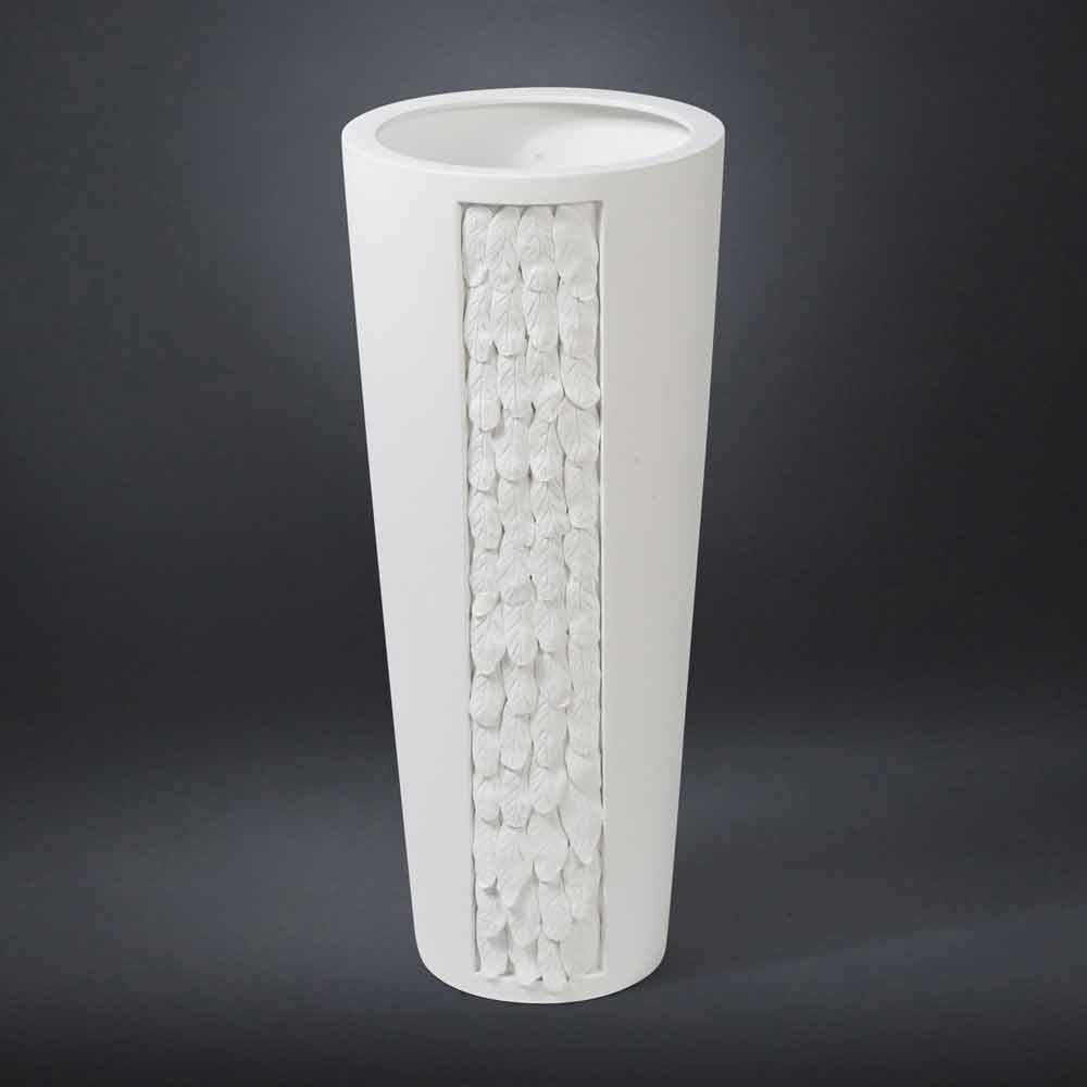Vaso alto per interni realizzato in Italia in ceramica bianca opaca tramite una lavorazione artigianale. Un'estetica scandita da forme essenziali arricchito da un'elegante dettaglio con trama a foglie che ricopre parte della struttura del vaso. Questo particolare insieme alla raffinata finitura scelta donano a questo complemento tutta la sua personalità rendendolo una soluzione perfetta per spazi caratterizzati da uno stile di classe. L'utilizzo della ceramica e la produzione artigianale lo rendono un elemento decorativo esclusivo e ricercato accrescendone il pregio e sottolineandone la qualità. Un'estetica ideale per i più svariati ambienti, dall'arredamento di casa a quello di hotel, ristoranti, zone contract, spa ma anche come allestimento per eventi e matrimoni.