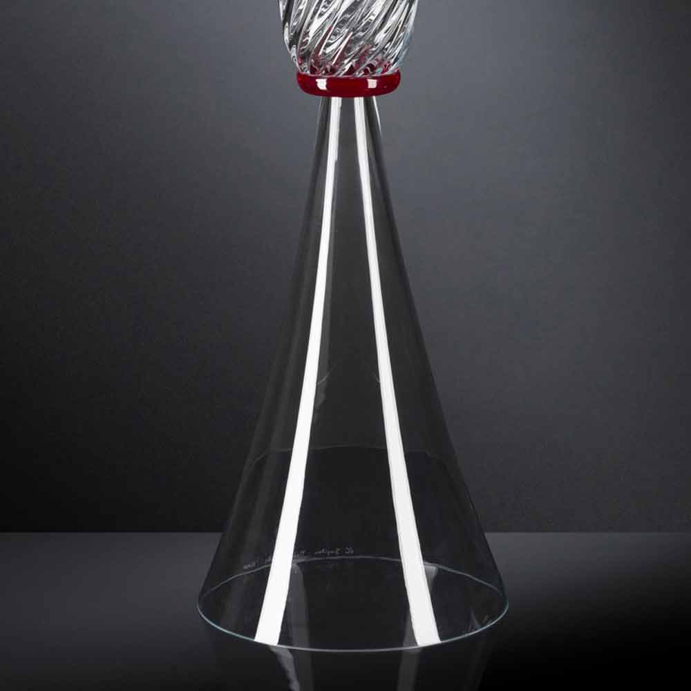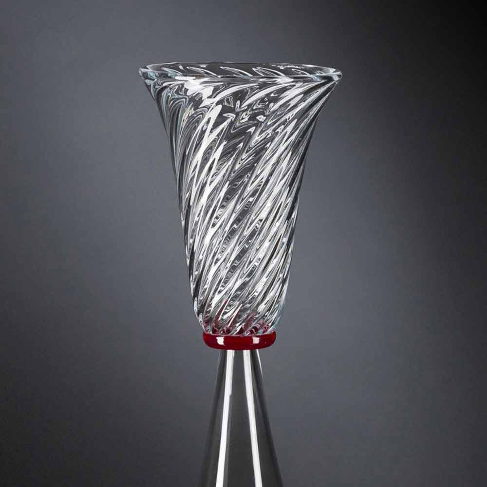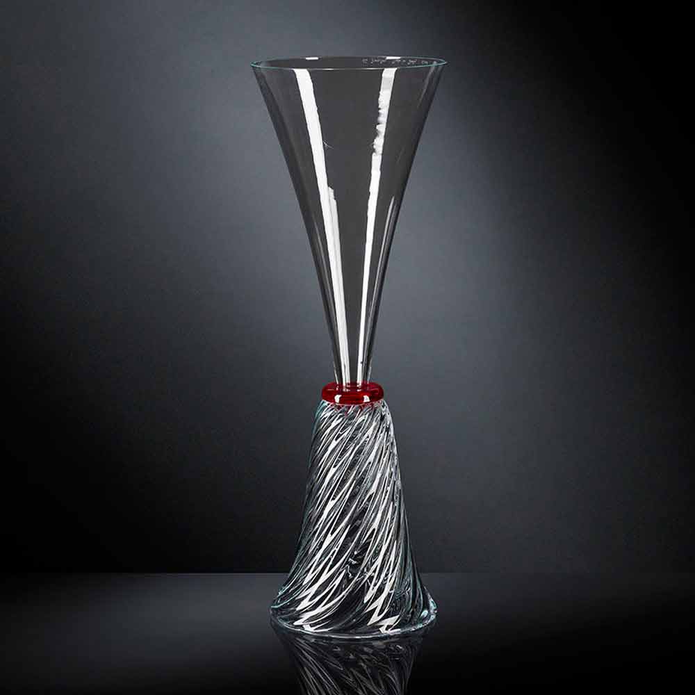 Vaso elegante per interni realizzato in vetro soffiato di Murano trasparente con dettaglio rosso tramite una lavorazione interamente Made in Italy. Un design unico e raffinato che ricorda le forme di una clessidra rivisitate in chiave contemporanea per dare vita ad un'idea di arredamento esclusiva e all'avanguardia. La sua estetica si dimostra particolarmente versatile grazie alle finiture neutre utilizzate che ne sottolineano al tempo stesso il pregio e l'alta qualità insieme alla meravigliosa lavorazione che caratterizza la parte superiore del vaso. Uno stile ideale per i più svariati ambienti, dall'arredamento di casa a quello di hotel, ristoranti, zone contract, spa ma anche come allestimento per eventi e matrimoni.