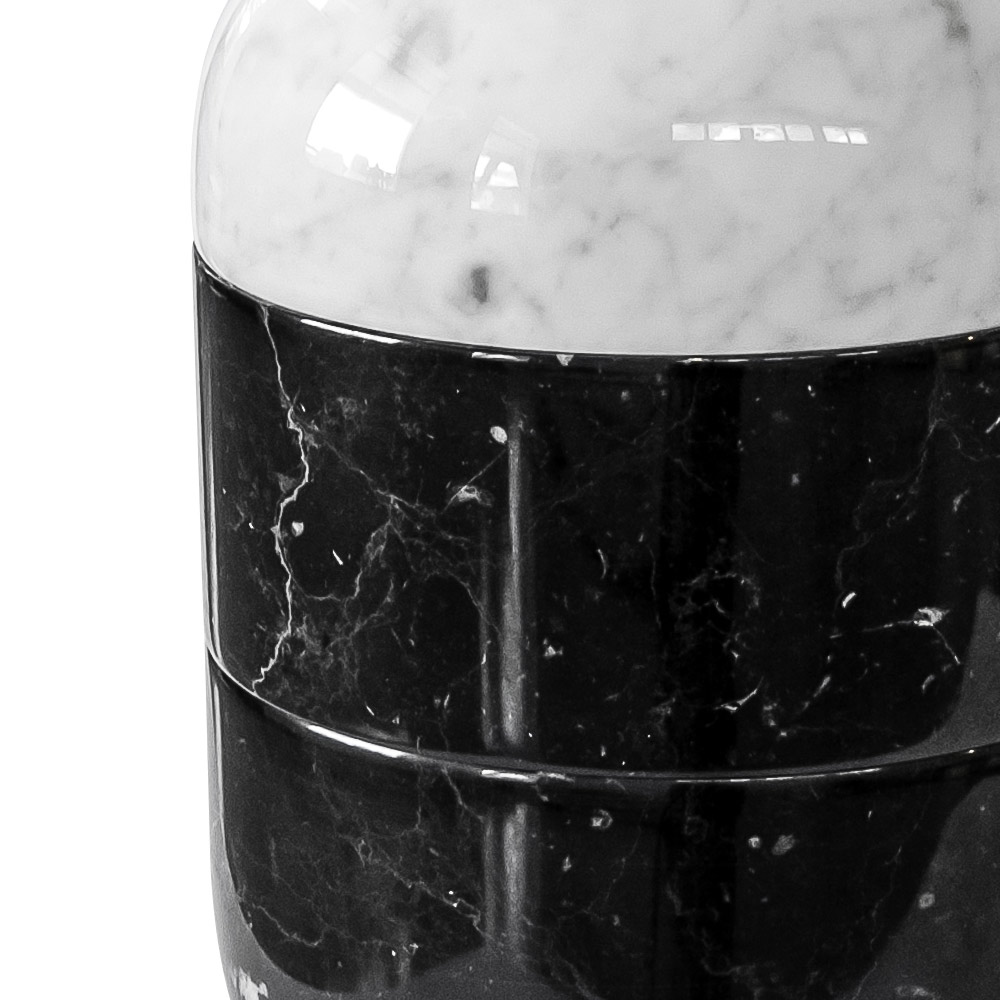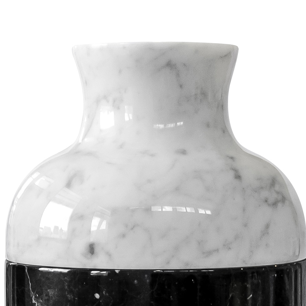 Questo vaso di decoro presenta un design artigianale e lussuoso suddiviso in 3 parti, interamente realizzato in marmo satinato bianco di Carrara e nero Marquinia.