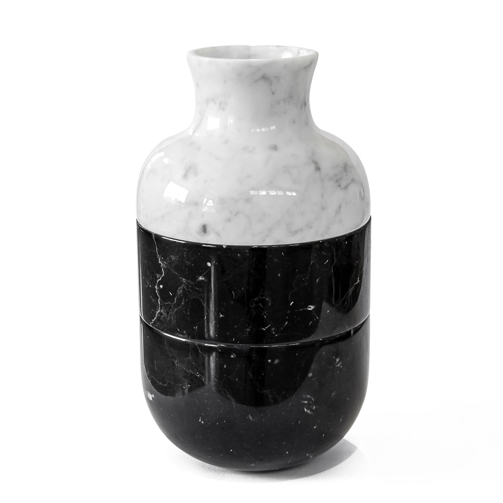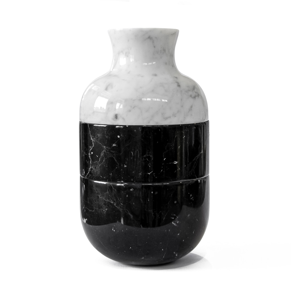 Vaso decorativo in 3 parti in marmo bianco di Carrara e nero Marquinia made in Italy.
