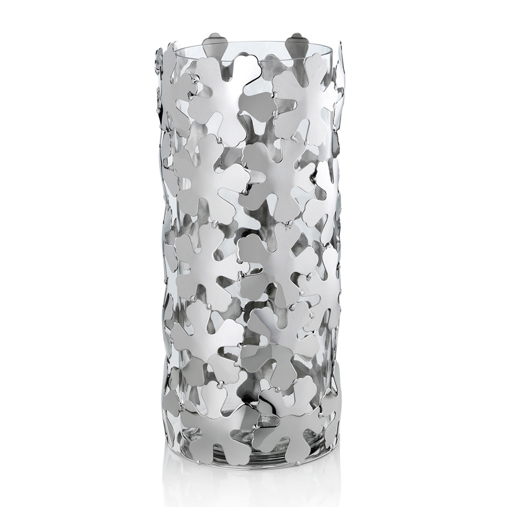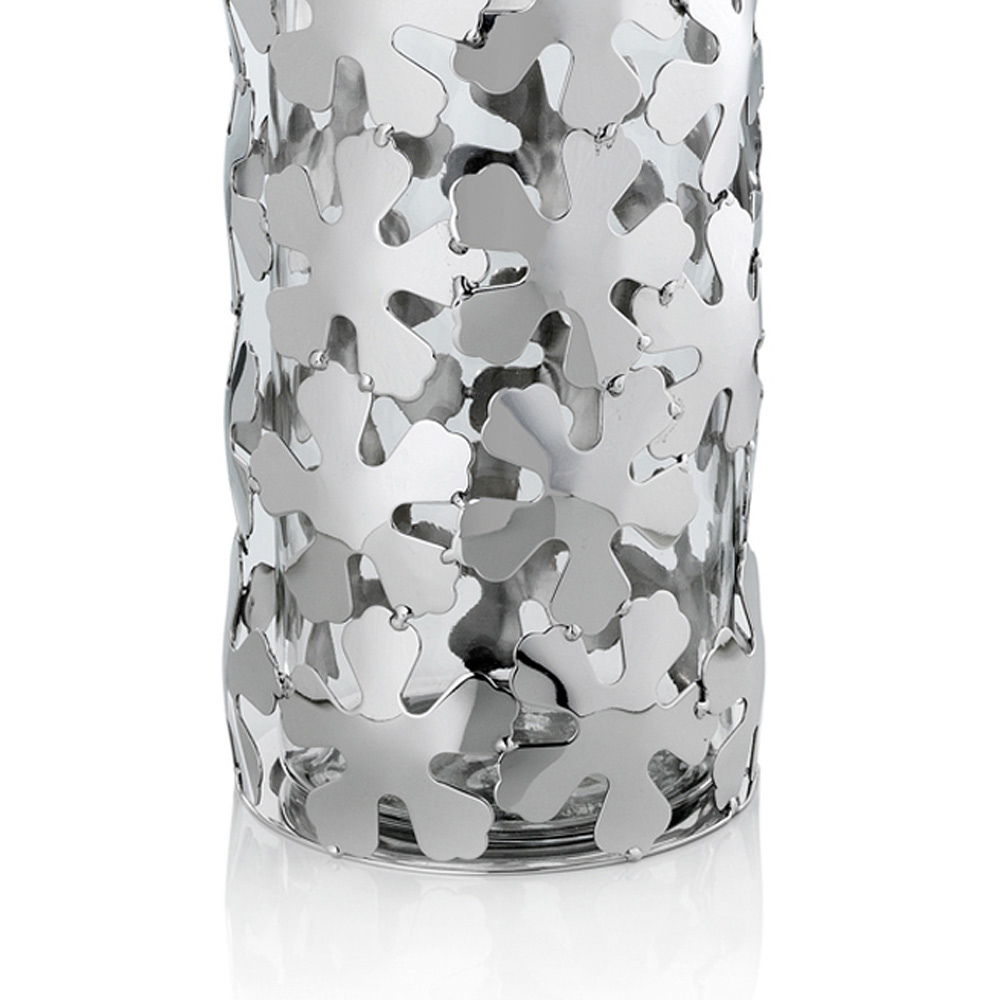 Vaso di decoro cilindrico in vetro e metallo argentato a fiore, lusso.