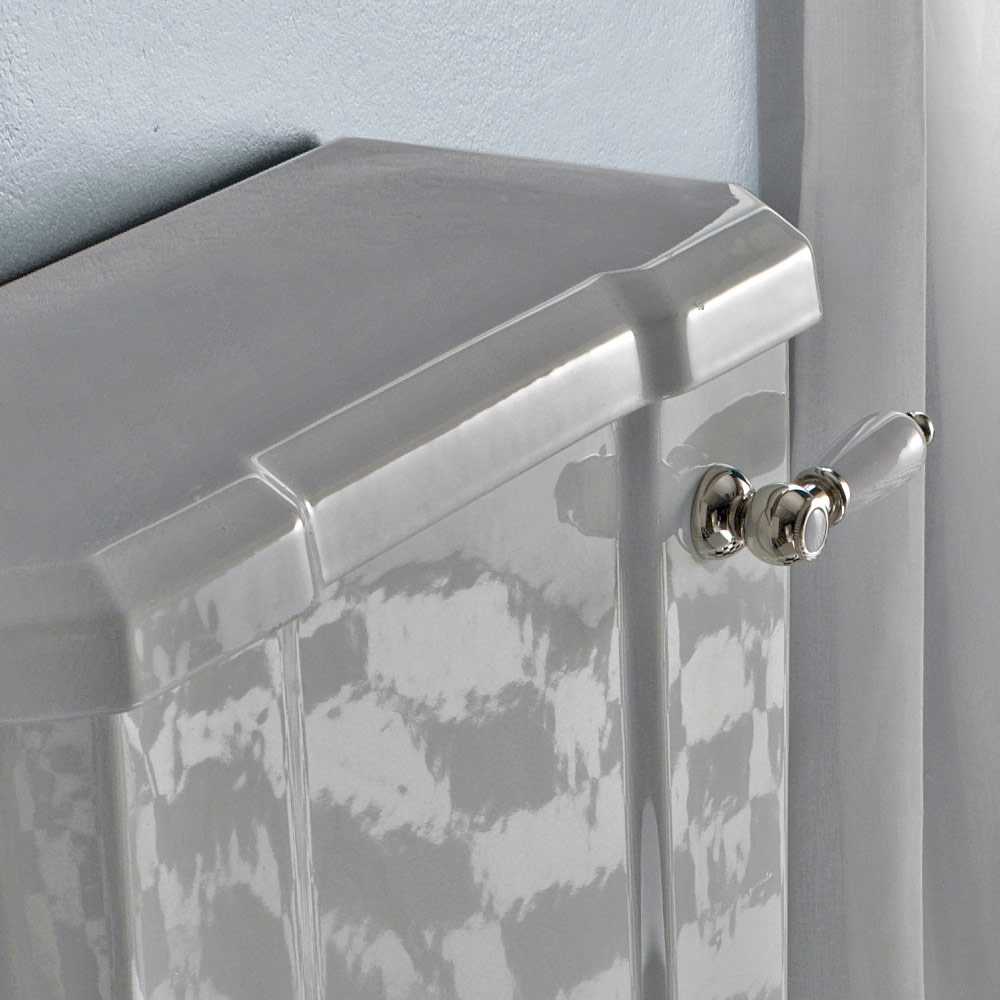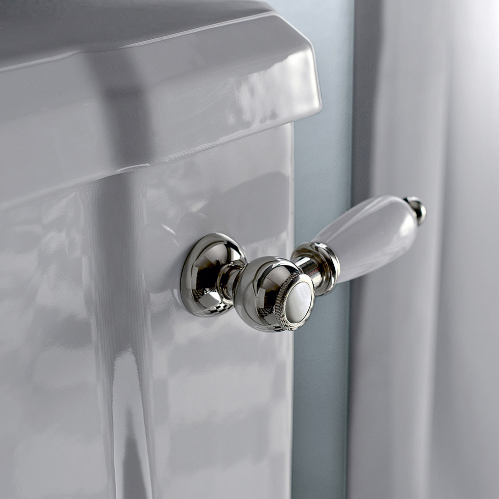 Marwa è un signorile vaso monoblocco a brida grondante e scarico a terra. Modernità e tradizione si fondono con l'utilizzo del sedile bianco con cerniere cromo e la cassetta monoblocco con foro per batteria di scarico con leva frontale in ceramica bianca e finitura nichel.