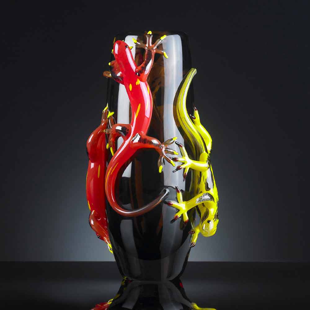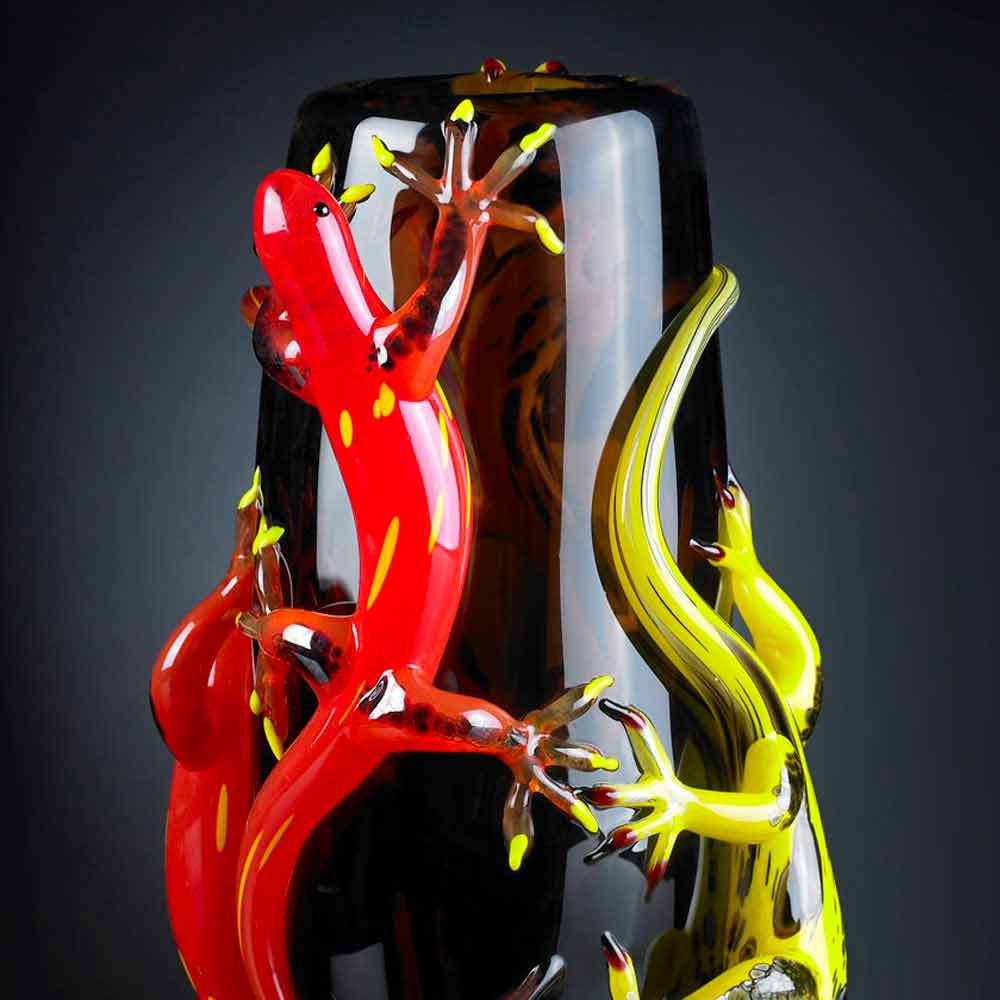 lavorato a mano in Italia da maestri vetrai esperti nel settore da generazioni arricchito da 4 gechi sui toni del giallo e del rosso. Un'eccentrico elemento decorativo capace di donare un