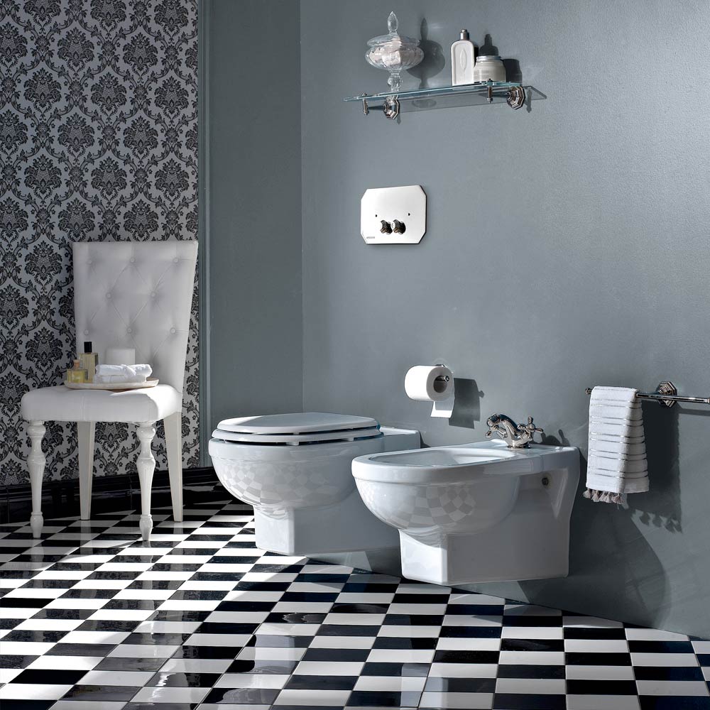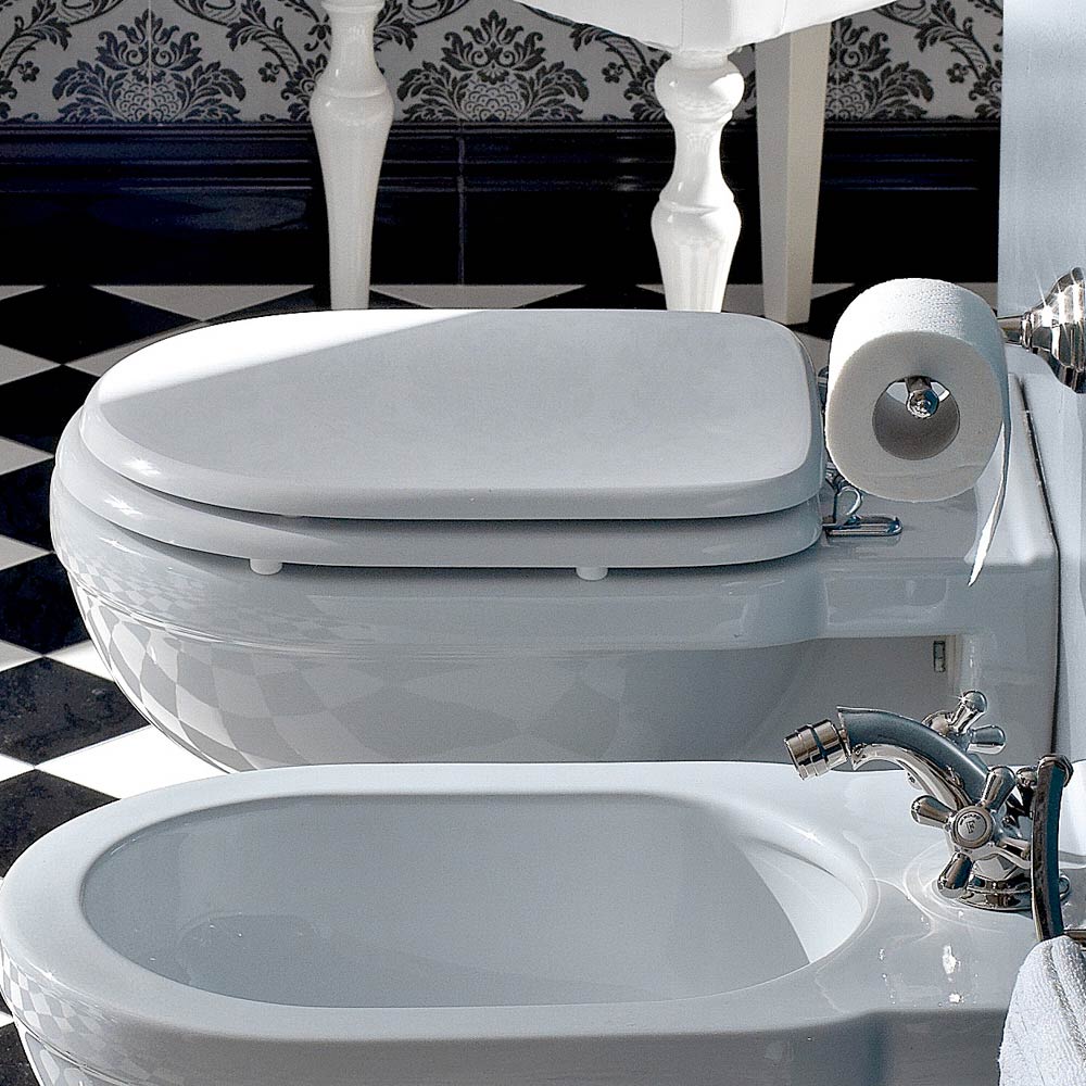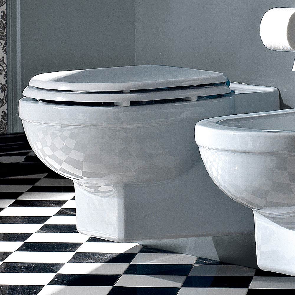 Vaso wc a sospensione di design vintage in ceramica bianca made in Italy.