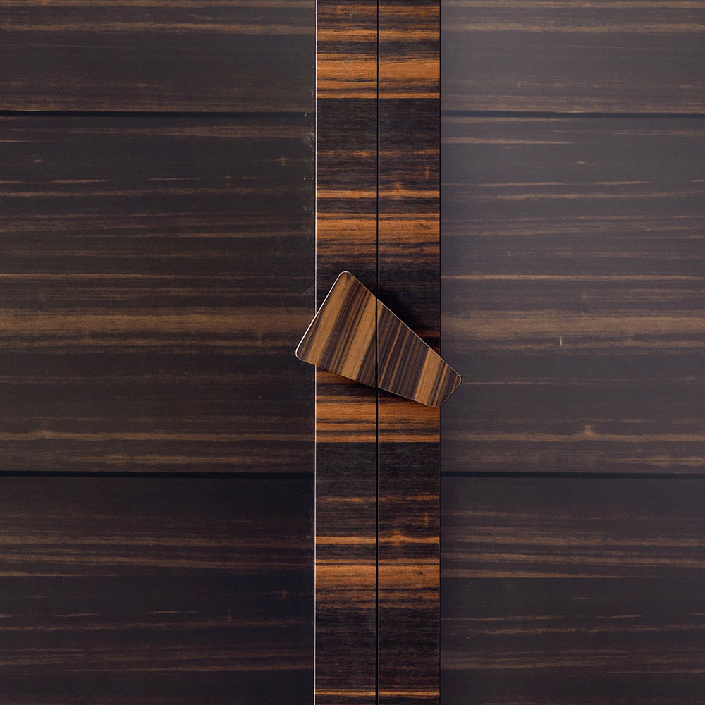 La vetrina Zarafa a due ante è caratterizzata da una lavorazione artigianale effettuata utilizzando materiali di pregio e servendosi dell'esperienza di abili artigiani italiani.