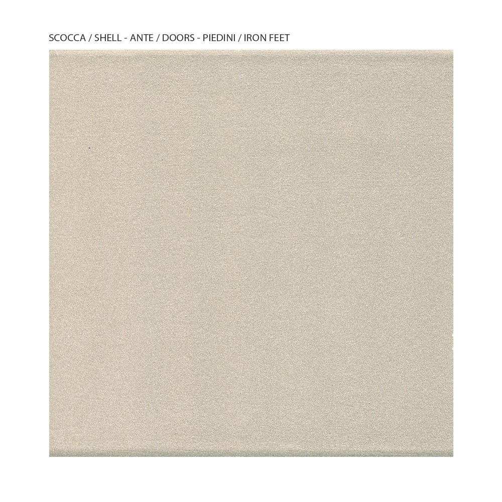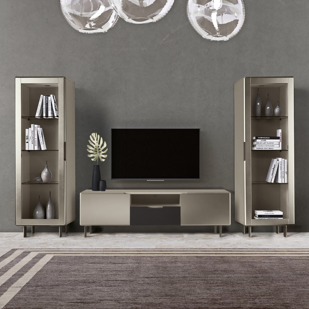 La vetrina per il soggiorno si caratterizza per il suo design semplice ed essenziale perfetto per arredare un soggiorno, un corridoio, una camera da letto e molte altre stanze. La vetrina composta da piedini in ferro finitura nichel è realizzata in MDF di colore visone e ante in finitura nichel con 3 ripiani interni in vetro.